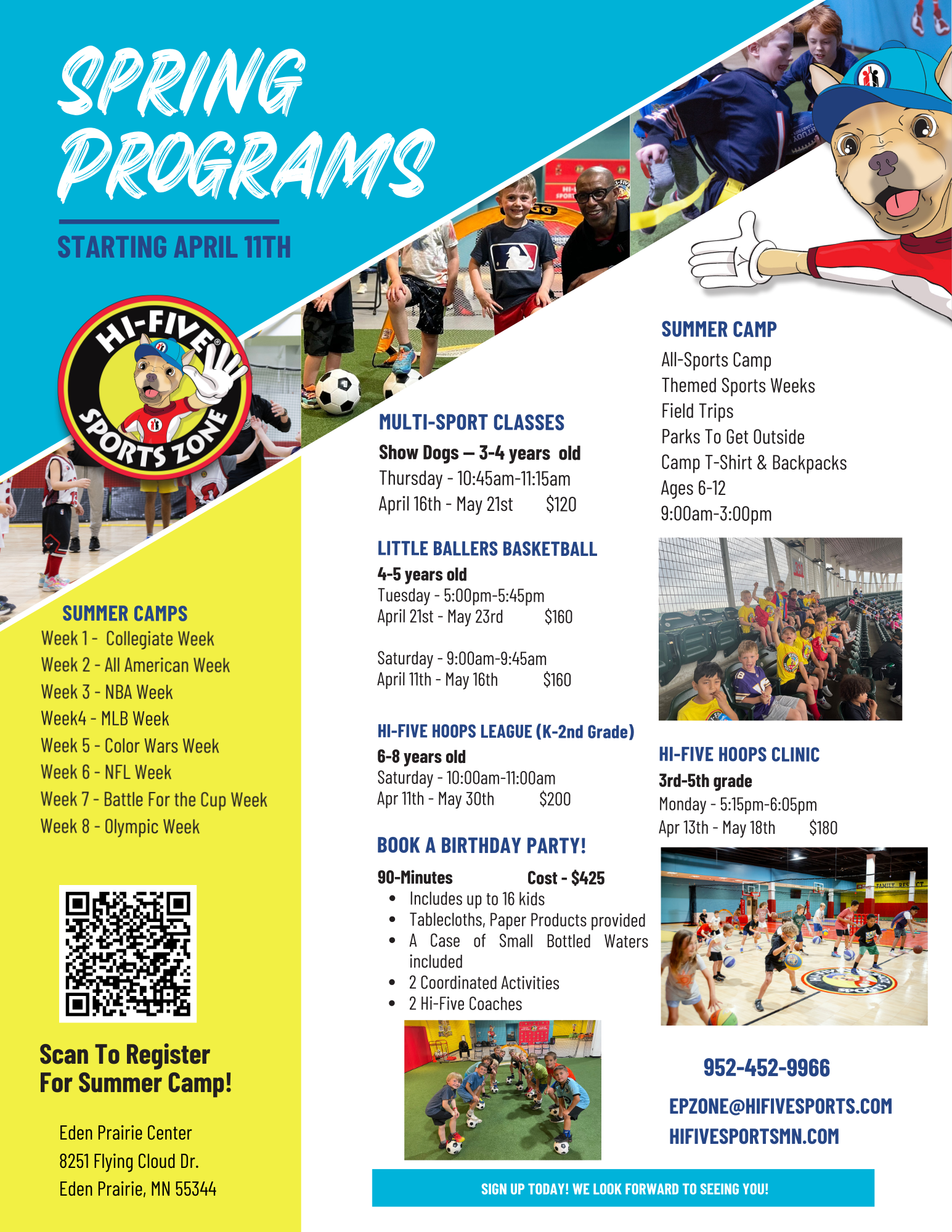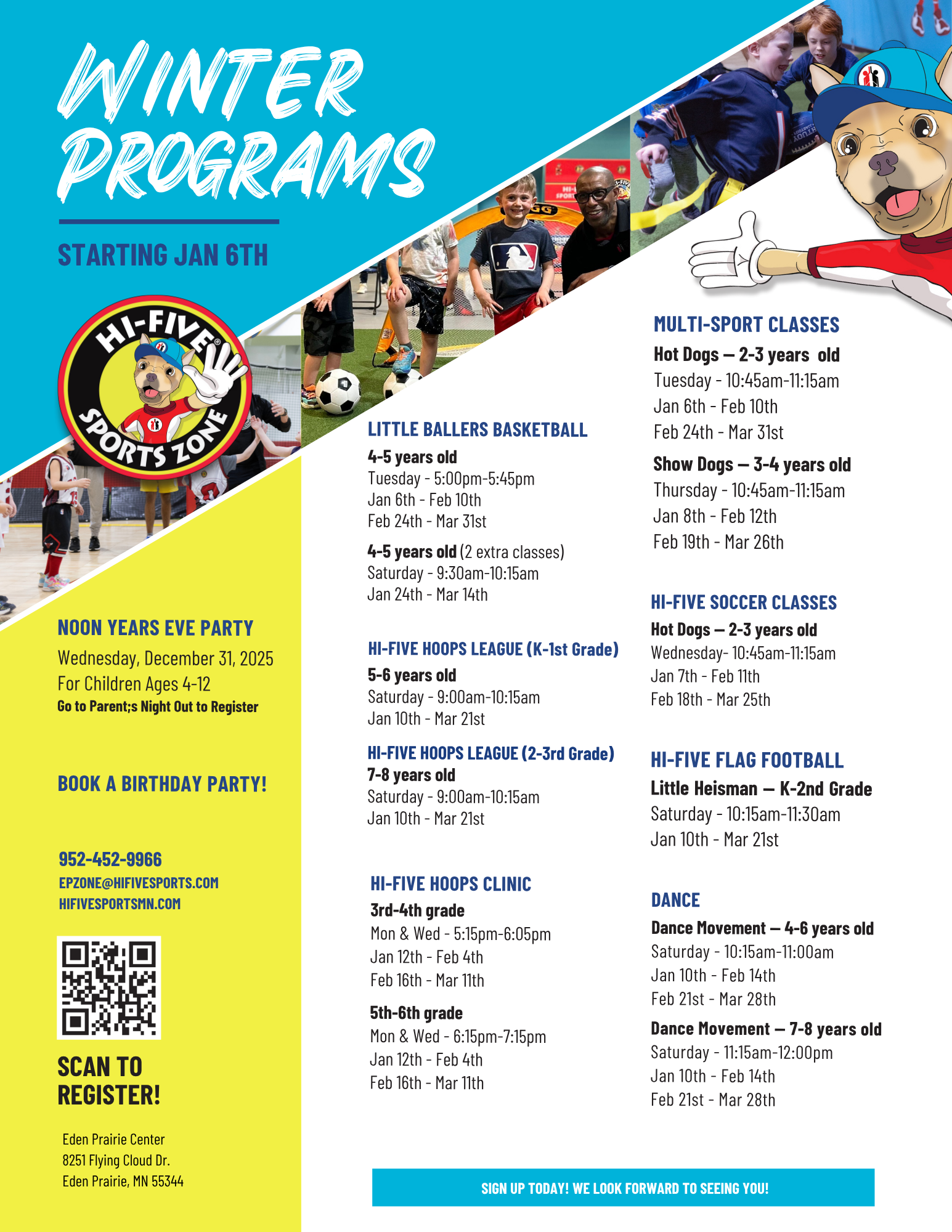 Hi-Five offers team sports classes, school-break camps, leagues/clinics, and birthday parties. This is the culmination of 30+ years of experience in youth sports. This isn’t your typical sports facility. It’s designed specifically for younger children with everything from the field size – to the height of our hoops – to the incorporation of our lovable mascot, Murphy. Our unique approach to sports programming and birthday parties will give families a truly unique experience.