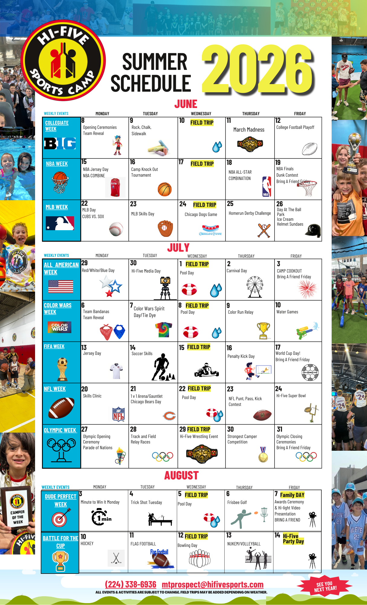 Hi Five Sports is excited to be your home away from home with our legendary Summer Camp Experience. Our coaching staff is experienced, patient, and passionate about sports and coaching each camper! At the start of each week, our coaching staff will divide each camper into balanced teams based on their age. Each week, campers will have the opportunity to learn about and compete in a wide variety of sports such as: basketball, baseball, soccer, flag football, gaga ball, handball, and so much more!